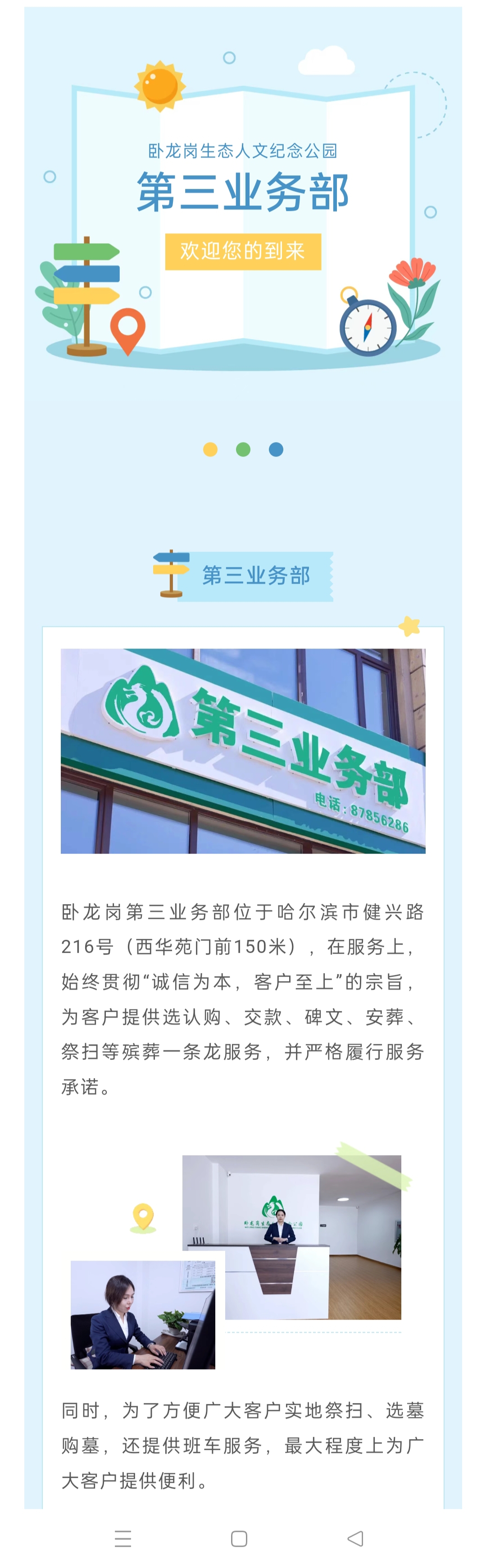 卧龙岗第三业务部位于哈尔滨市健兴路216号(西华苑门前150米),在服务上,始终贯彻“诚信为本,客户至上”的宗旨,为客户提供选认购、交款、碑文、安葬、祭扫等殡葬一条龙服务,并严格履行服务承诺。